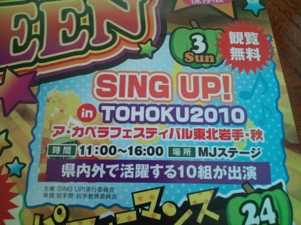 「SING UP! IN TOHOKU/ア・カペラフェスティバル 東北岩手」とは、 東北を中心とする、ア・カペラや音楽の大好きな人達がひとつになれるイベントを目指し、2回目の開催となります。 音楽を通して人と人とが通じ合い、世代、性別を問わない交流、その場所作りを目的とし、 イベントを通じ岩手県内外、東北、その周辺で活躍するア・カペラ愛好者のネットワークを広げ、 出会い・創る感動、声の力を参加者、観覧者、スタッフで分かち合いたいと考えています。 |
